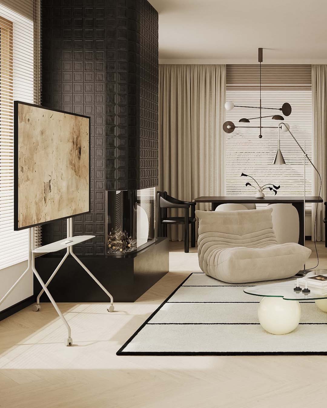 Połączenie klasycznej elegancji z nowoczesnym szykiem, gdzie subtelne sztukaterie spotykają się z prostymi formami. Wnętrze pełne światła, klasy i ponadczasowego stylu.